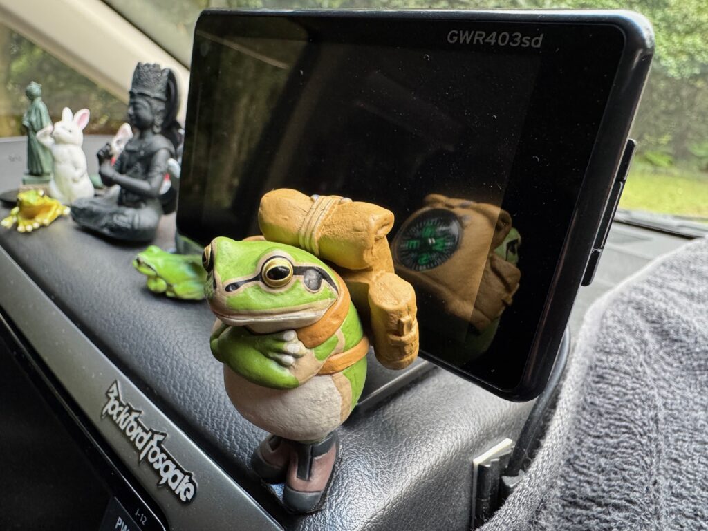 何故、無事カエル君なのかと言うと、後の反射からもわかるように背中のリュックに方位磁針が付いているのです。つらくるようにひもが付いていたので、バックパッカーのリュックに一度は付けたのでしたが、あまりに笑えるので、いつも見えるダッシュボードにしたのでした。
