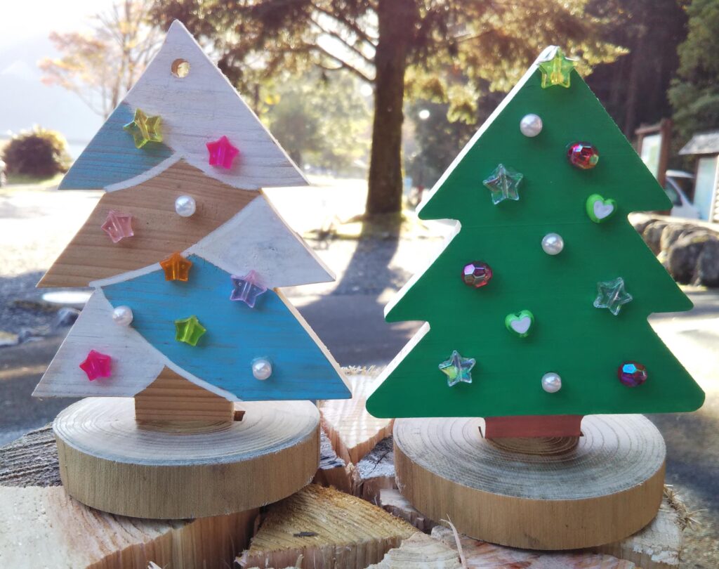尾鷲ヒノキをツリー型にカットした板にポスカで色をぬって、ビーズを貼り付けて卓上クリスマスツリーの出来上がり!