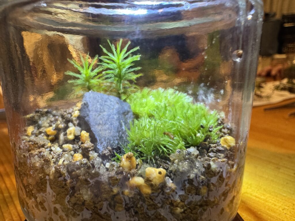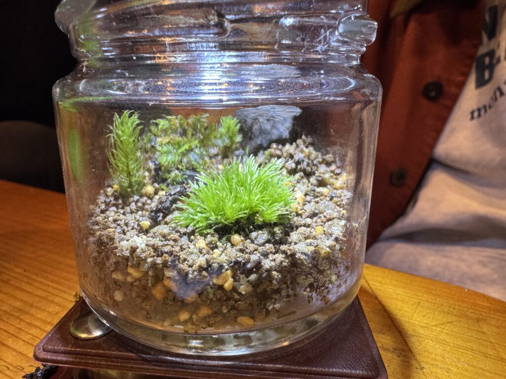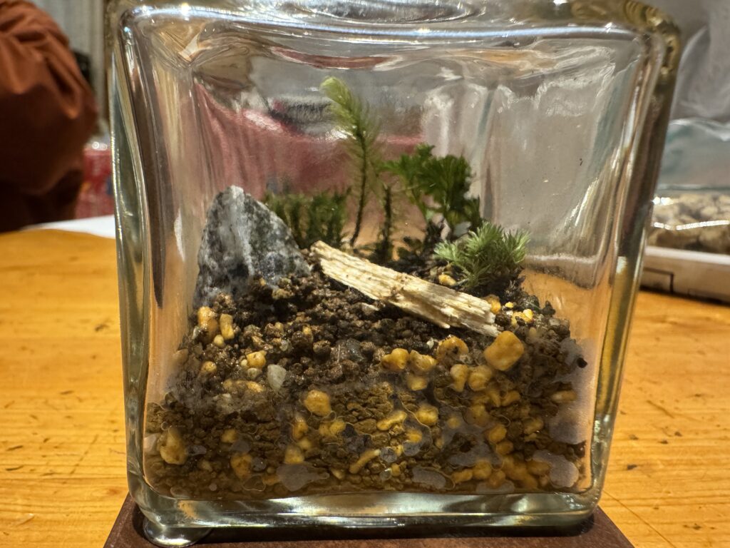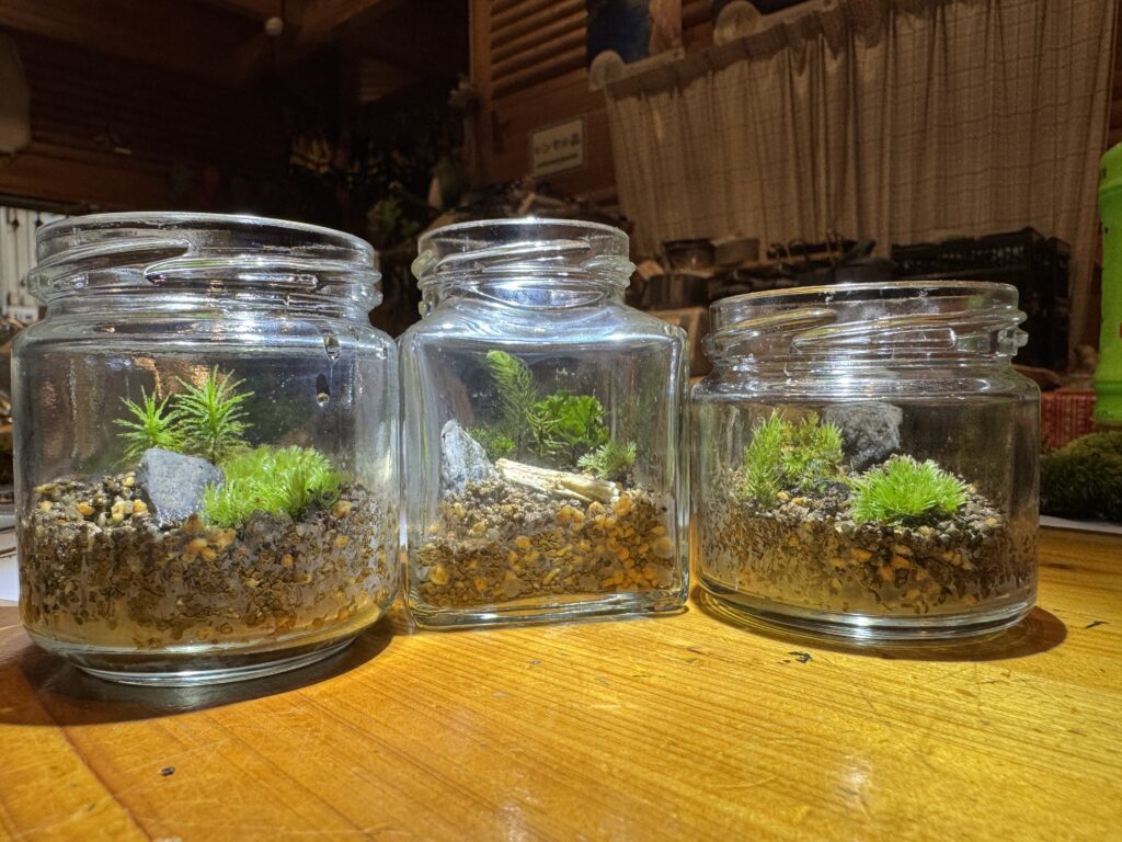 ヤドリギさんも私もコケには素人ですが、場内のコケを調べテラリウム体験をしてみました。