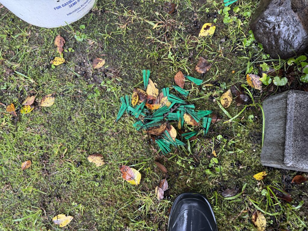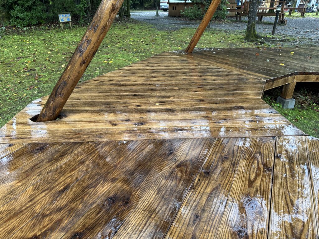 こもれび広場にヤドリギさんが作ってくれたデッキに木の実が落ち黒くなってしまった部分があるのです。近々コケたんけんたいの催しがデッキ会場ですし。