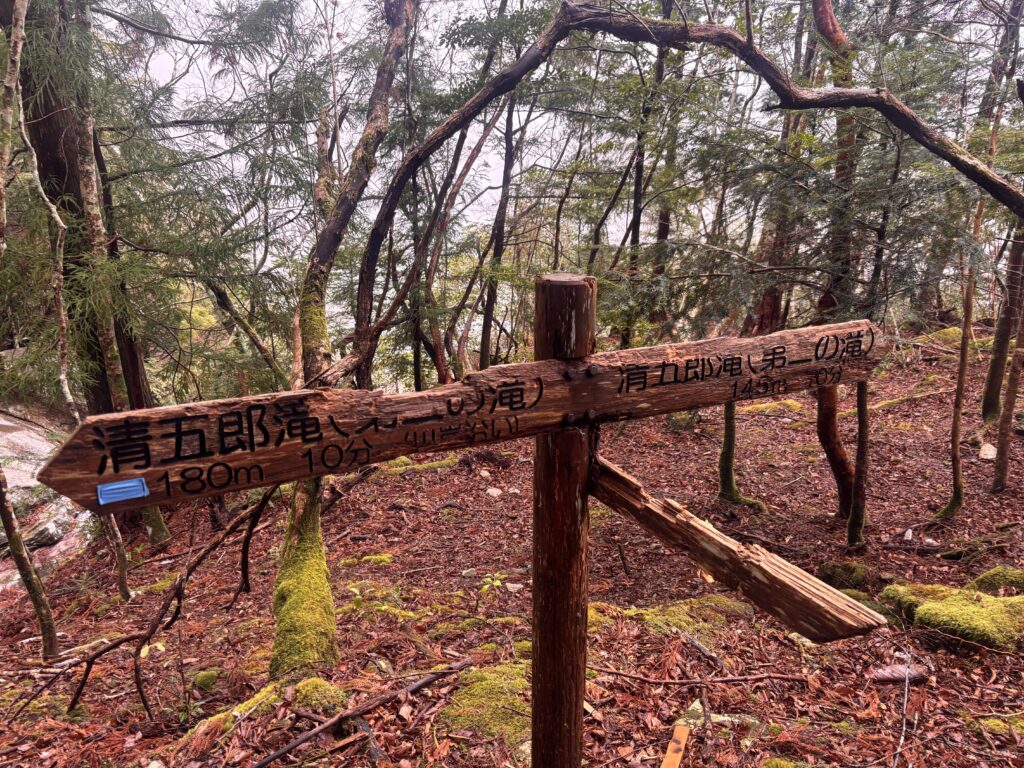 登山口からしばらく降りると分岐点。看板が若干朽ちてしまってますが、右に行くと第二の滝。左に行くと第三の滝。