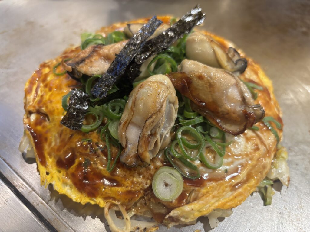 焼けたお好みの上にカキを載せたら『幻の渡利カキ入りお好み(関西風)』の出来上がり!