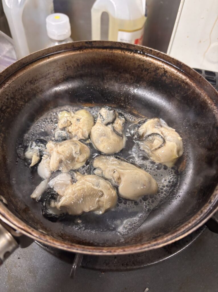 カキはむき身にして軽く焼き色がつくまで焼いていきます!